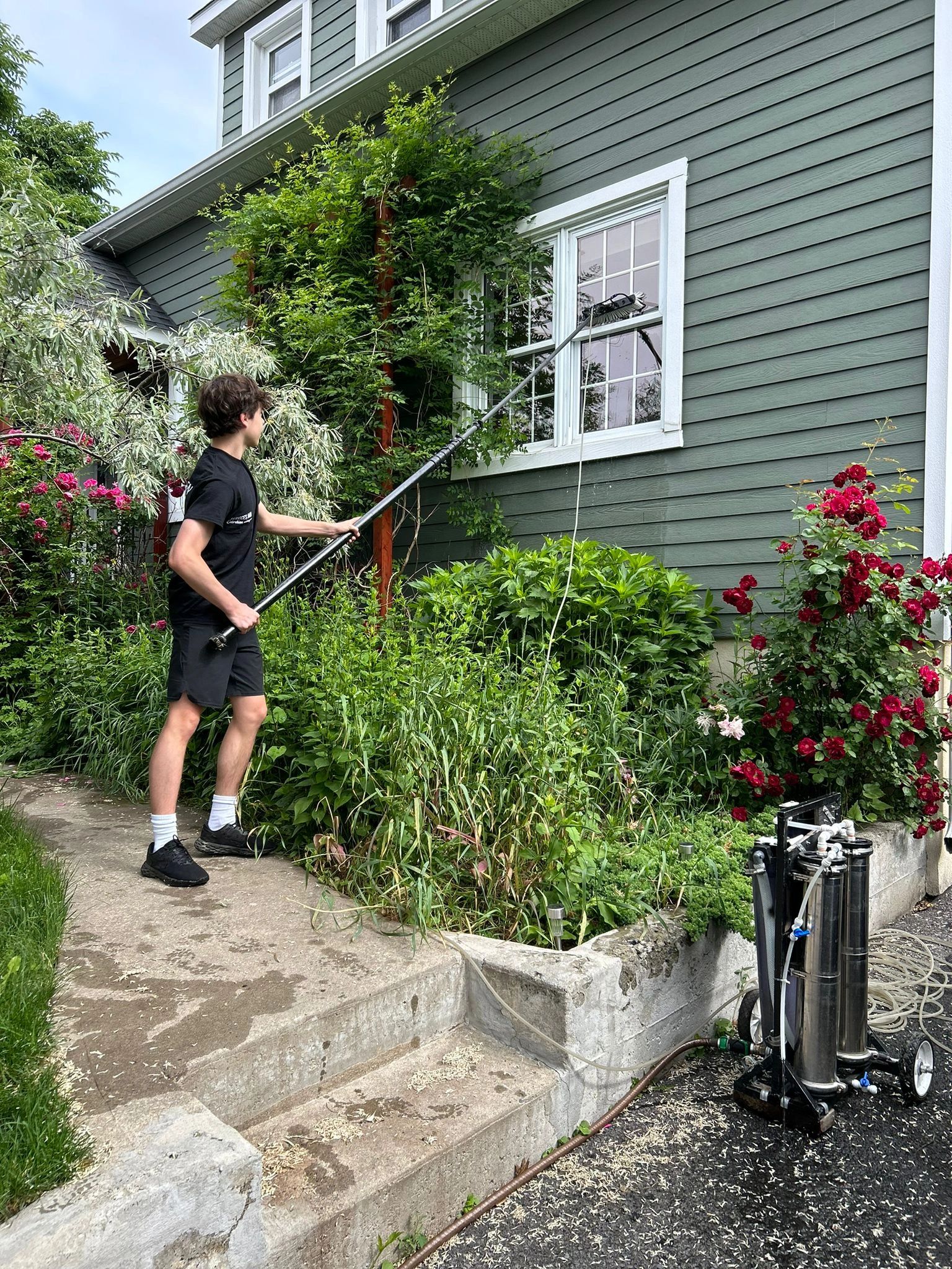 Je suis muni d’une perche à eau pure qui lave les vitres jusqu'à 35 pieds de hauteur sans avoir besoin d’échelles. L’eau pure permet un nettoyage sans agents chimiques, seulement avec de l’eau purifiée à 0 ppm, ce qui ne laisse aucune trace.